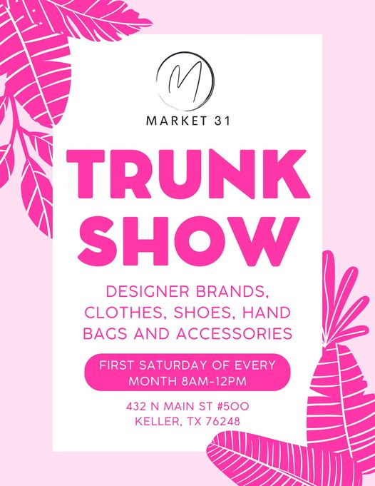 Description: Market 31 is hosting a monthly Trunk Show every first Saturday of every month! We will have designer brands, clothes, shoes, handbags and accessories. Come shop and enjoy some mimosas and refreshments!
